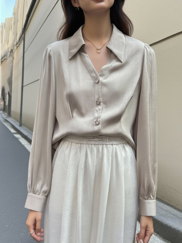 Long Sleeves Loose Buttoned Pleated Solid Color Lapel Blouses&Shirts Tops