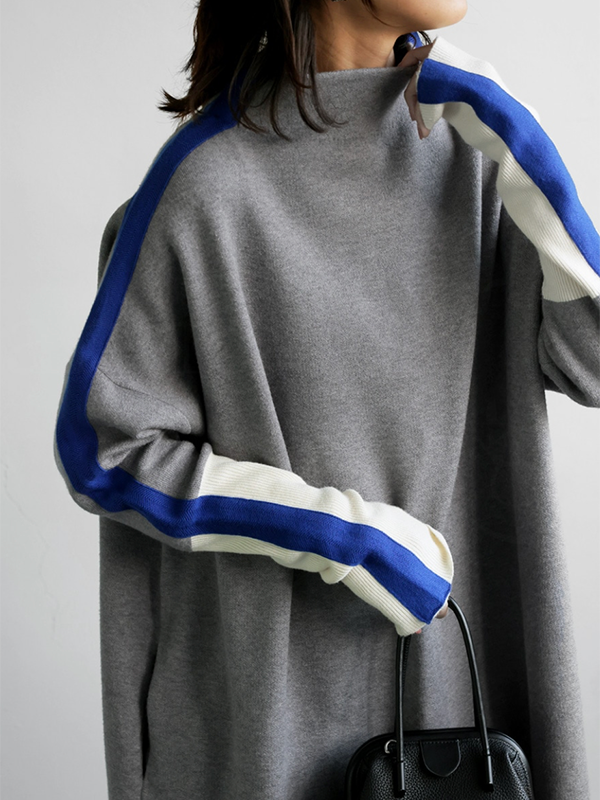 Long Sleeves Loose Contrast Color Stand Collar Maxi Dresses
